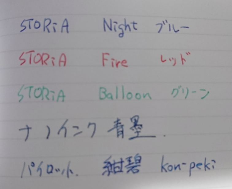これまで、セーラーから出ている「青墨」と「STORiA Balloon<グリーン>」を使っていました。しかし、「青墨」は色が濃いので、少し裏写りしていて、「グリーン」の方は色が薄いので少し見難いという部分がありました。そこで、その間ぐらいの濃さの色として、「STORiA シリーズ」の「Night<ブルー>」を購入しました。