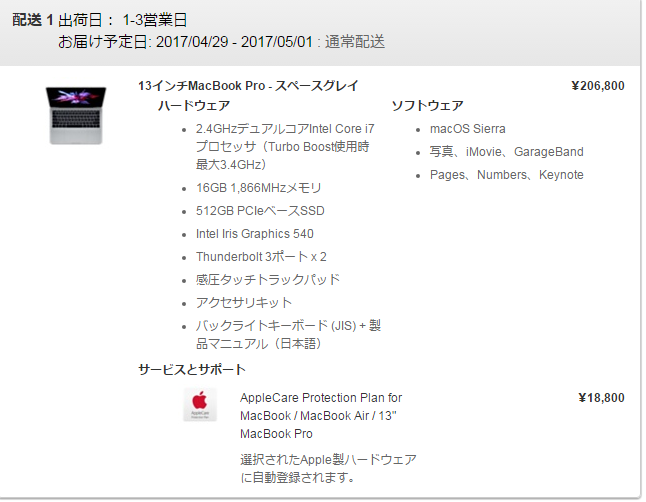 そして、今回のMacBook Proも長く使う予定なので、AppleCareも付けました。
