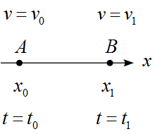 $t=t_0$で$x_0$の位置(点A)にある物体が移動して、$t=t_1$で$x_1$の位置(点B)にあったとする。