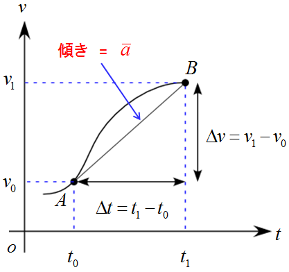 平均の加速度\ \bar{a}=\frac{\Delta v}{\Delta t}=\frac{v_1-v_0}{t_1-t_0}