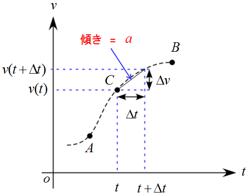 平均の加速度がわかったら、今度はある瞬間の加速度を考えてみましょう。