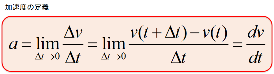 a=\lim_{\Delta t \to 0} \frac{\Delta v}{\Delta t}=\lim_{\Delta t \to 0} \frac{v(t+\Delta t)-v(t)}{\Delta t}=\frac{dv}{dt}