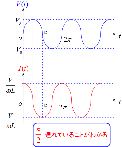 となり、コイルに流れる電流の位相は電圧の位相より$\frac{\pi}{2} \mbox{[rad]}$だけ遅れていることになる。