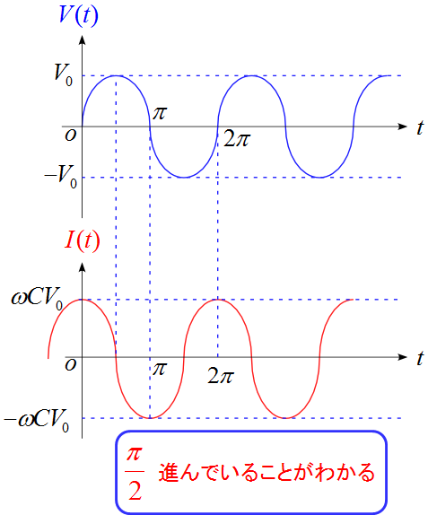 となり、コンデンサーに流れる電流の位相は電圧の位相より$\frac{\pi}{2} \mbox{[rad]}$だけ進んでいることになる。
