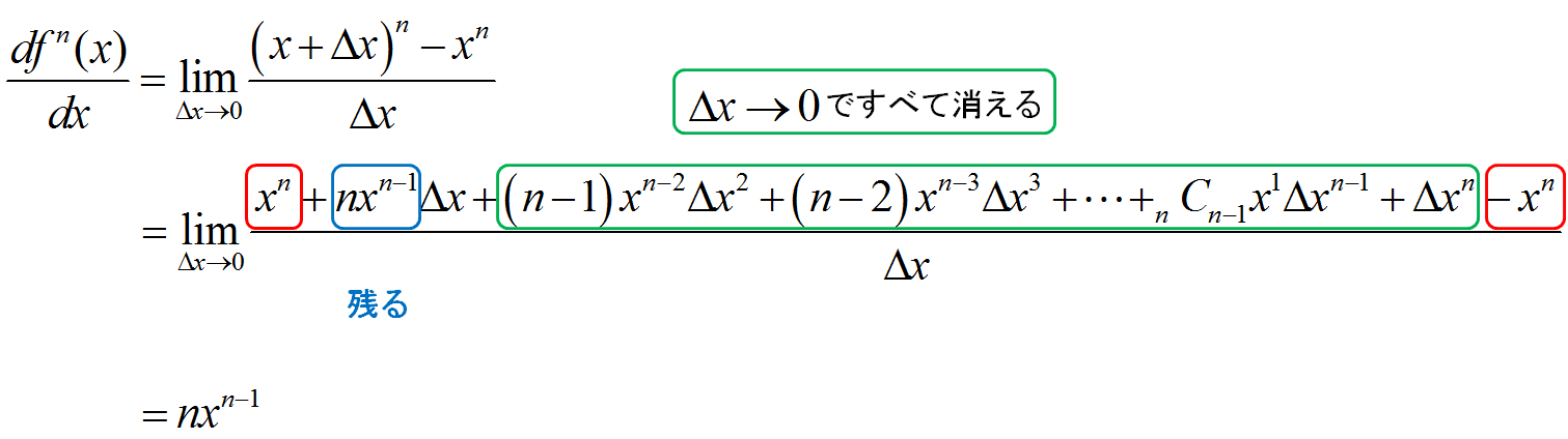 $\Delta x$が1次の項は分母の$\Delta x$と約分になって$nx^{n-1}$が残る。