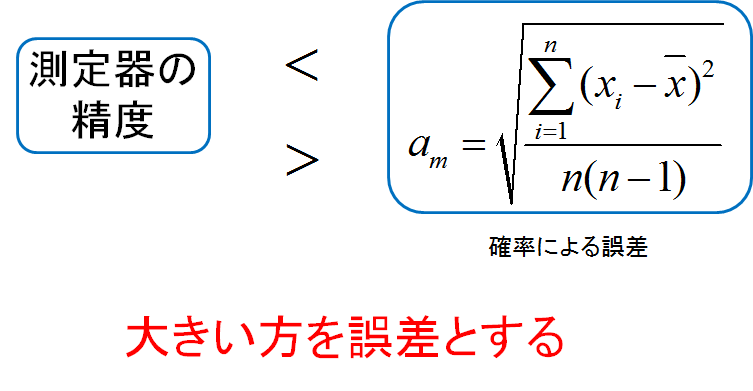 「測定器の精度」の値と「確率による誤差(ばらつきによる誤差)」の値を比べて大きい方を「その測定の誤差」として採用する。