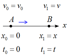 点Aの時、$x_0=0,\ t_0 =0,\ v_0=v_0\ $ とする。