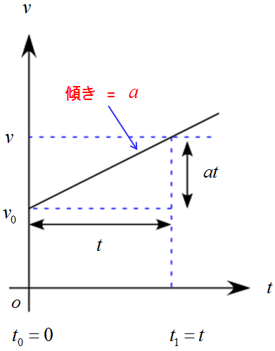 速度はスタート時、$v_0$で一定の割合で増加していく。つまり、等しい加速ということを表している。