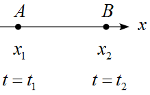$t=t_1$で$x_1$の位置(点A)にある物体が移動して、$t=t_2$で$x_2$の位置(点B)にあったとする。