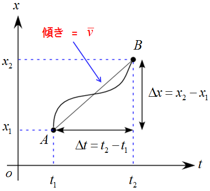この運動では、$\Delta t =t_2-t_1$の間に$\Delta x =x_2-x_1$だけ変位したことになります。