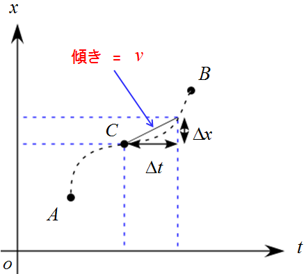 この変化率$\frac{\Delta x}{\Delta t}$が平均の速度$\bar{v}$になります。